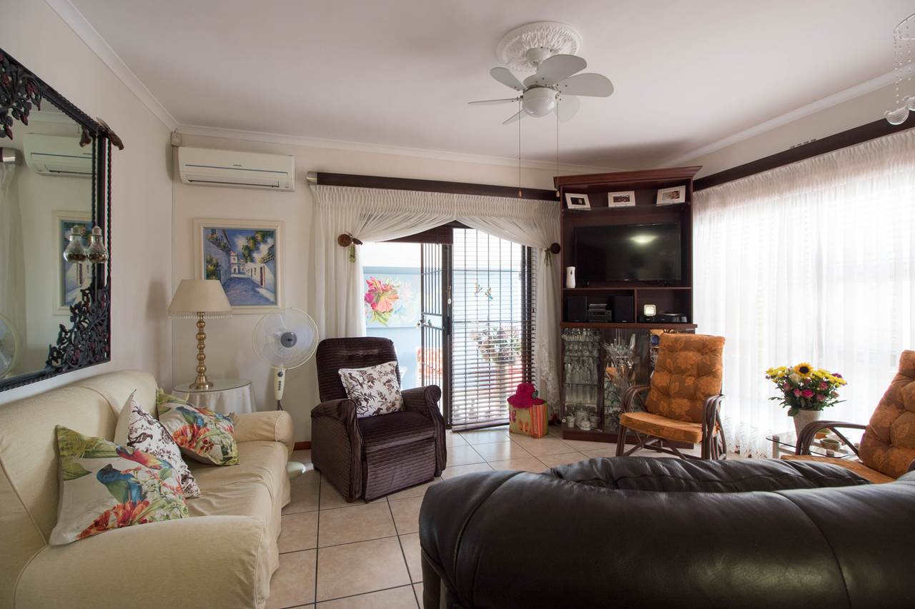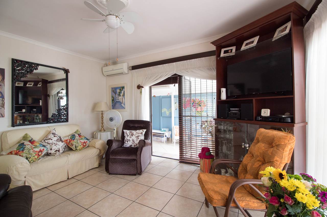 Offering a tiled lounge with an aircon, opening to a tiled sun room with sliding doors on the one side opening to the driveway and then opening up to the back garden on the other side.
