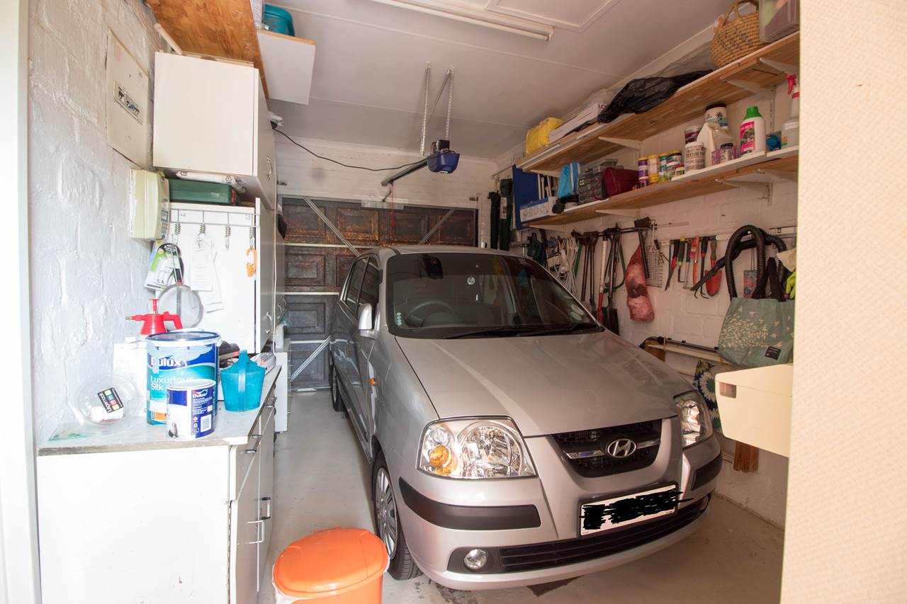 Kitchen with oven/hob opens to the garage. The garage floor is painted and partly tiled and the garage has an automated door with a back up battery for when it is loadshedding. The garage also has a ceiling. From the garage you can either enter the kitchen or there is another door leading to the garden.